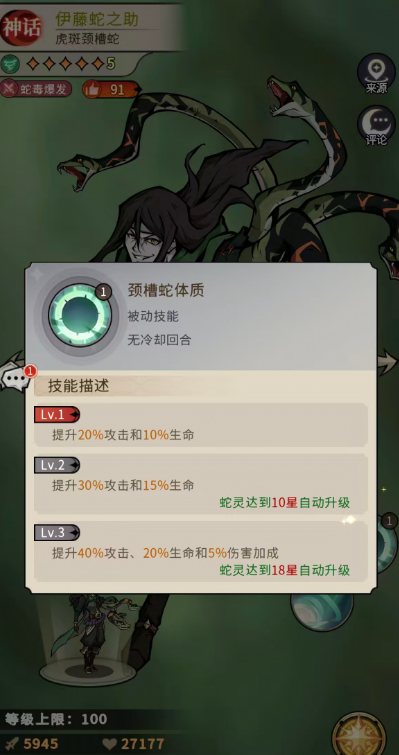 颈槽蛇体质作为伊藤蛇之助的基础增益能力,其中基本就是在上场的时候就可以直接触发的,触发这个效果之后,在上面可以提升伊藤蛇之助20%攻击和10%生命数值,最多的时候是将此类增益技能升级到3级,这个时期提升的数值就到了40%攻击、20%生命和5%伤害加成了,而这个增益基本也是在他达到18星级的时候才可以触发到的强度,最后一个技能叫做狩猎本能,根据伊藤蛇之助最后的这个被动效果,在回合开始的时候,此时场上要是存在蛇毒标记的单位,伊藤蛇之助可以立即对合格目标发动一次恶堕蛇手的技能攻击,而后续这个技能效果会冷却3回合,当然要是当时场上不存在蛇毒标记的敌人,那么此时就会给敌方生命百分最低的那位目标施加一层蛇毒的效果,这个效果在一战斗开始时,就可以让伊藤蛇之助获得10%攻击提升的增益效果。