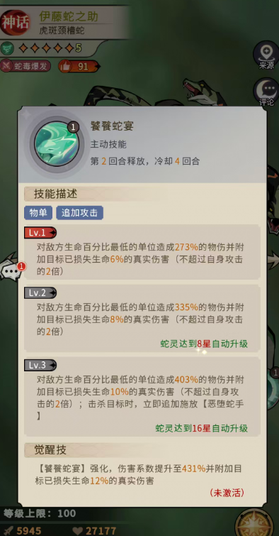 饕餮蛇宴技能在当前追求的物理单攻的强度,而且会有更多的追击攻击次数可用,在上面利用技能效果伊藤蛇之助可以对敌方生命百分比最低的的目标单位造成273%的物伤,且还可以附加目标当前已经损失生命数值当中6%的真实伤害,这个数值最高的时候是不能超过伊藤蛇之助自己攻击的2倍数值的,其次就是在升到三级的时候,这个效果就会变成击杀目标时,立即追加施放恶堕蛇手的一次攻击,这一次的追击带来的效果就非常好用了,后期在饕餮蛇宴技能得到强化之后,其中的伤害会提升到431%的数值,此时还可以附加目标已损失生命12%的真实伤害哦。