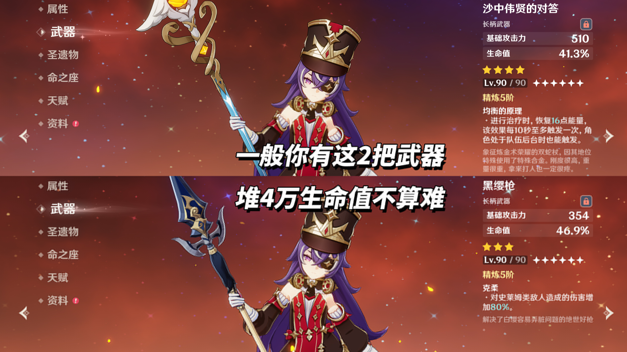 增攻数值为夏沃蕾生命值/1000*1%,至多40%攻击力增幅,即需要4万生命值。由于夏沃蕾不堆充能(部分需高频火伤破机制的环境可堆点),达成此条件很轻松,带生命武器即可,如沙中伟贤的对答、黑缨枪。