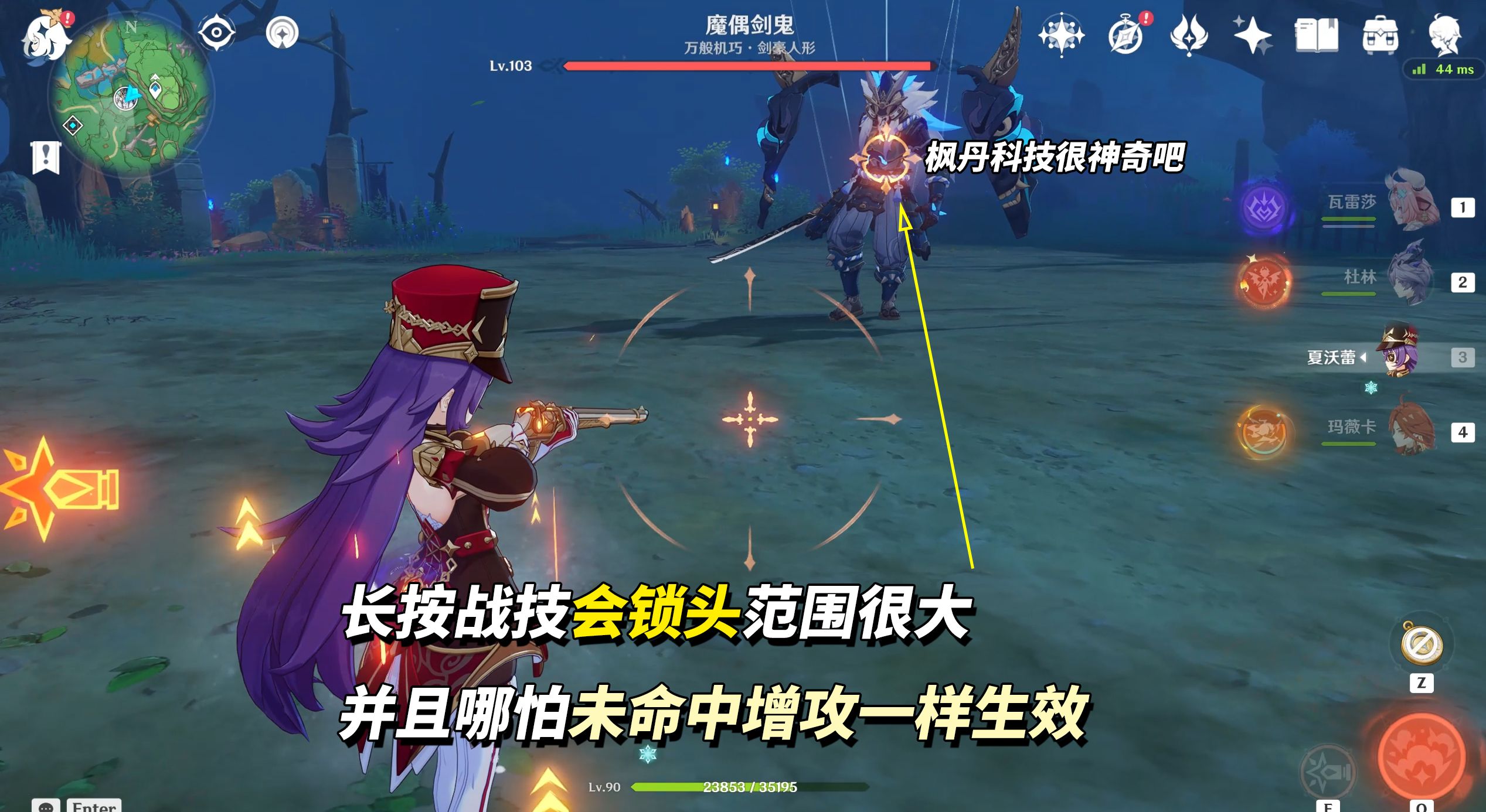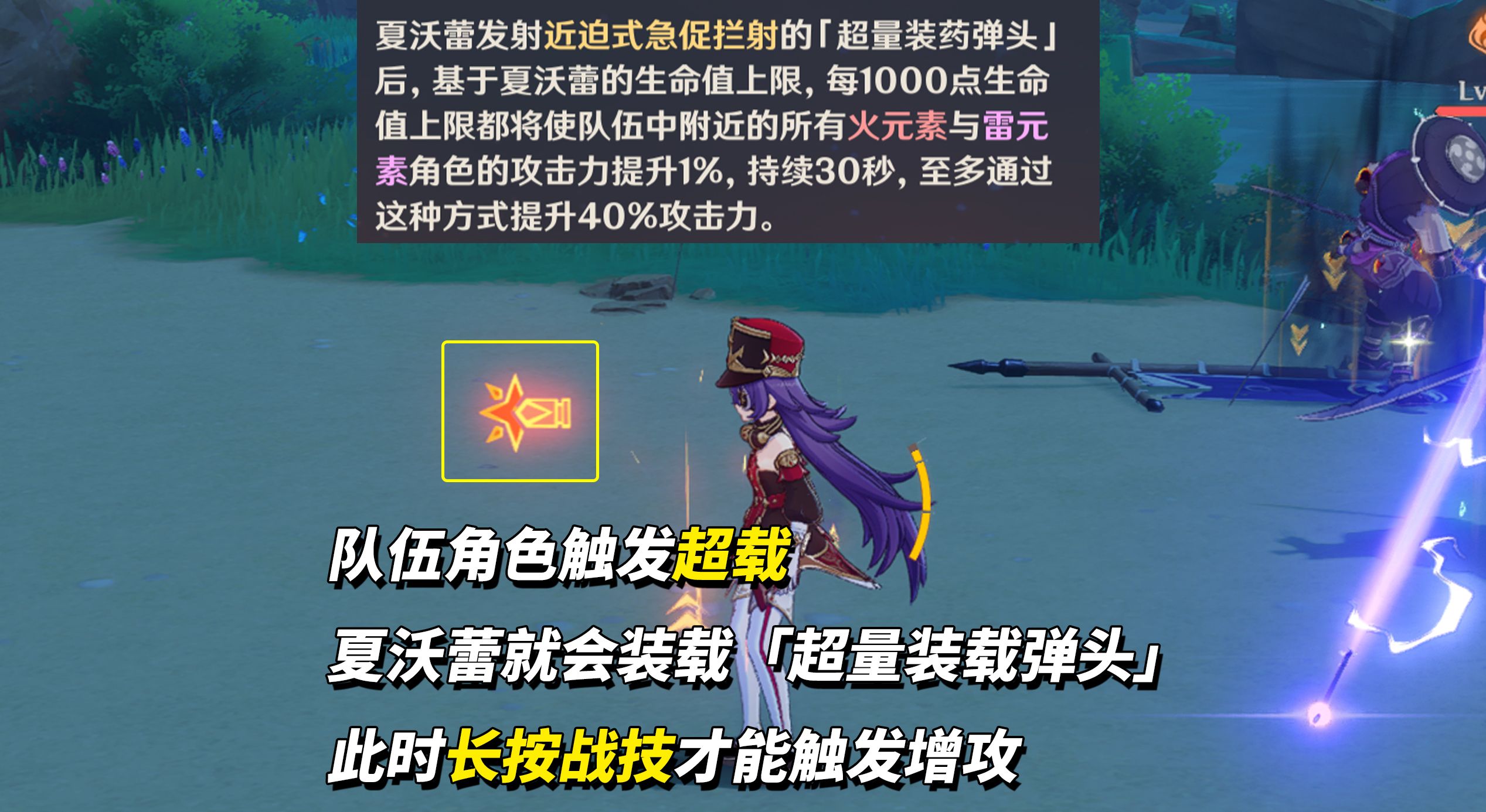 场上任意角色触发超载,夏沃蕾身上会出现「超量装载弹头」符号,此时长按战技发射可触发全队雷火角色增攻,无需命中敌人。