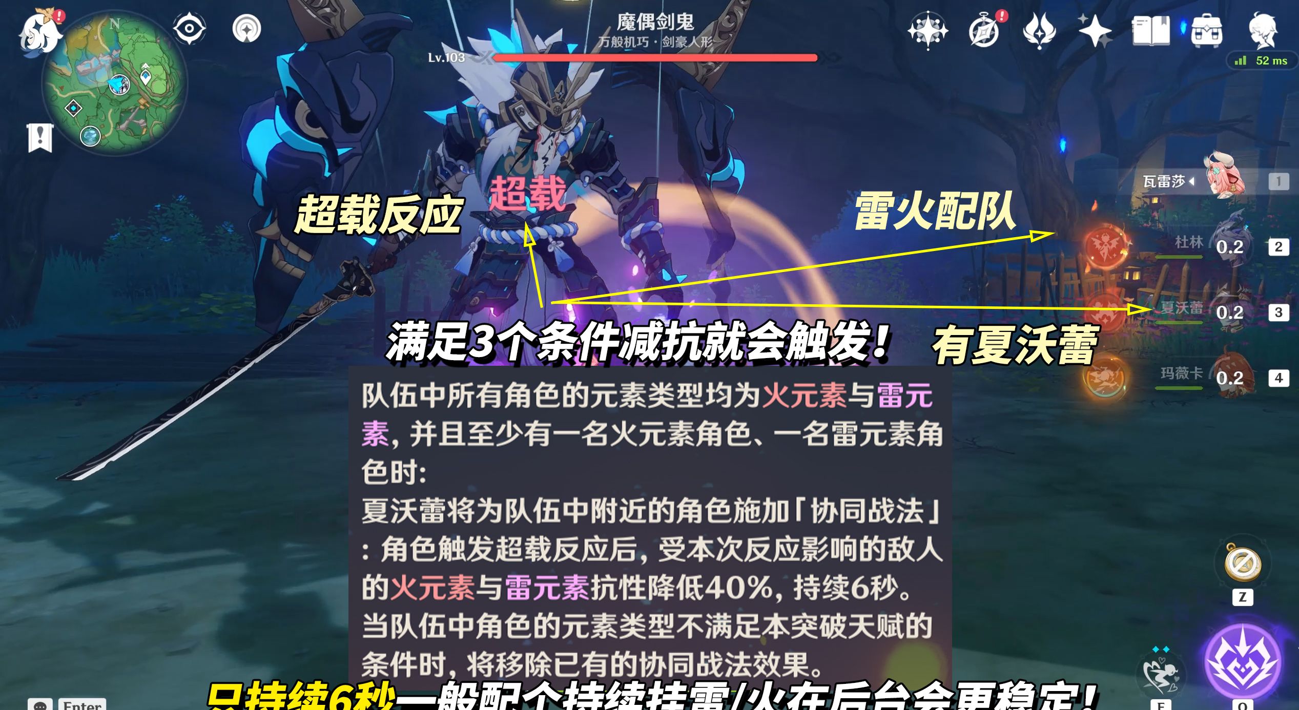只要夏沃蕾在队伍且队内只有雷火角色时,敌方受到超载伤害就会触发,降低40%雷火抗性。