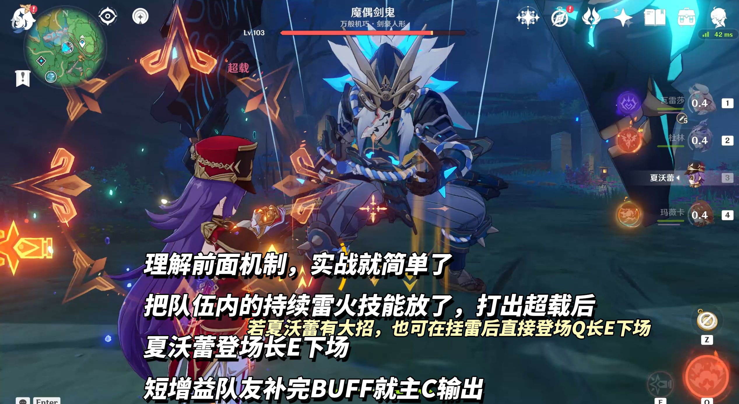 雷C配持续挂火队友、火C配持续挂雷队友。先挂雷、火元素打出超载,夏沃蕾上场长按战技,随后切短覆盖率的增益角色上BUFF,切主C进入正式输出。