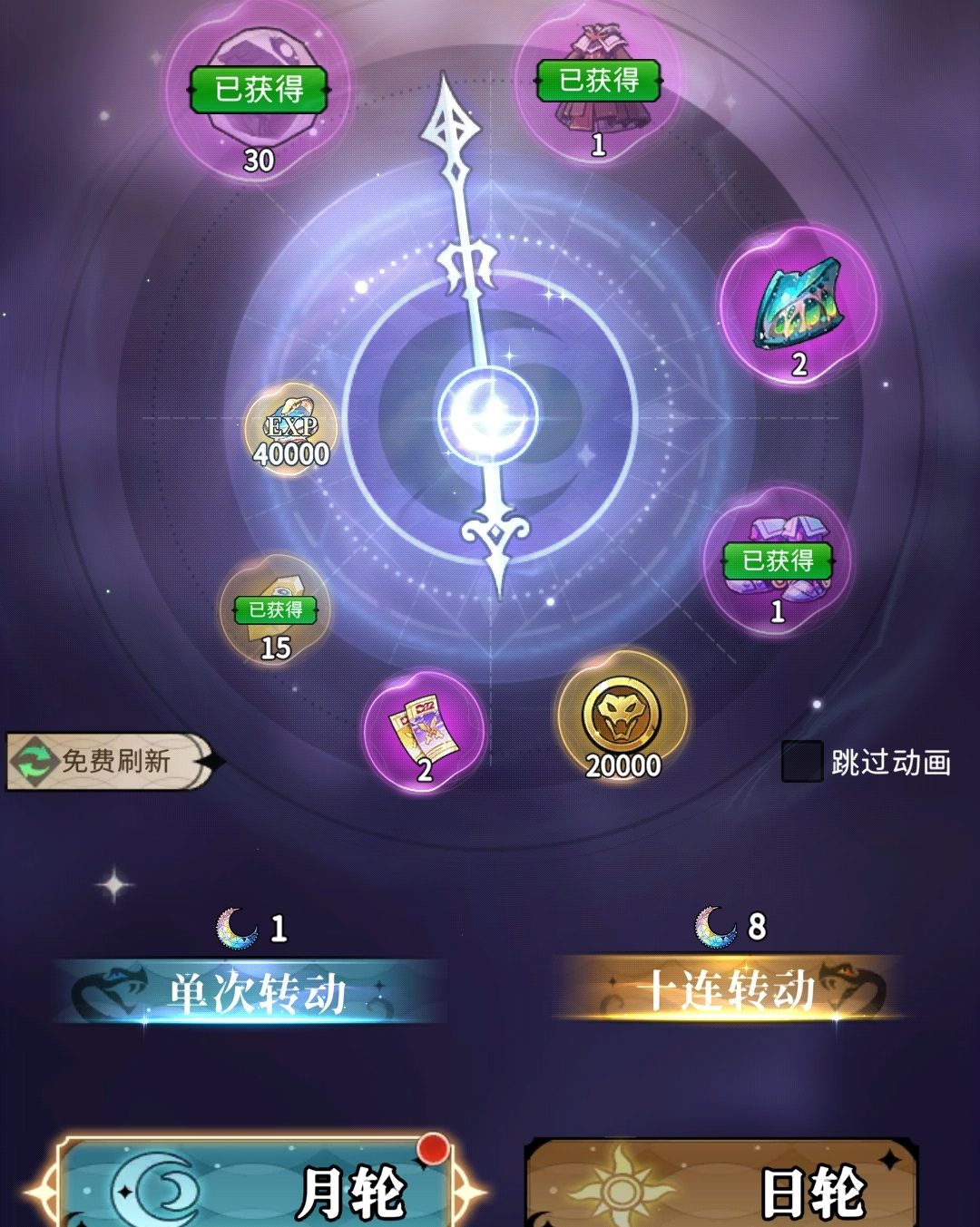日月轮分为月轮与日轮,其中月轮可抽取出高级蛇灵结晶、橙色武器等物品,也能获得探索卷、蛇鳞等各类资源,每次转动日月轮都需要消耗一个月之匙,集齐十个后可连转十次。日轮与月轮有着同样的转动机制,但它消耗的是日之匙,玩家可以从中获得橙色装备、特定的蛇灵结晶等,其中特定的蛇灵结晶在收集满50个后,可合出特定蛇灵。