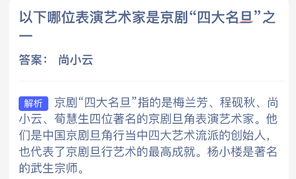 以下哪位表演艺术家是京剧“四大名旦”之一?【蚂蚁新村每日一题】2026年1月5日题目已发布!坚持答题,积累木兰币,即可加速小镇建设。答对本题,立即可享“产速+3/时”的加速奖励!今天正确答案是【尚小云】。京剧“四大名旦”指的是梅兰芳、程砚秋、尚小云、荀慧生四位著名的京剧旦角表演艺术家。