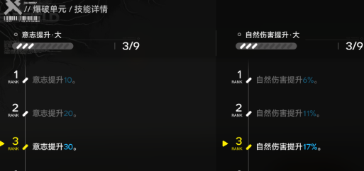 这把武器主要是以意志强化作为基础,搭配强力的腐蚀特效,就可以形成亮眼的作用。爆破单元的核心在于三维属性的精准配比,主属性一直提升,从初始10点慢慢提升到90点,可以给技能伤害提供稳定的支撑。自然伤害提升,从60%慢慢叠加到50%每一次的攻击都可以打出足额的属性伤害。比较有特色的就是腐蚀性狂热技能,将腐蚀效果的战略价值直接拉满,可以延长50%的腐蚀持续时间,还能额外的降低敌人的防御能力,最高可以达到43%.