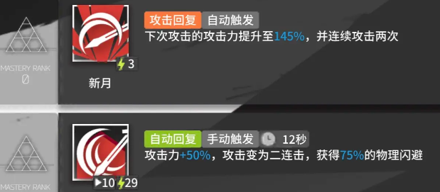 他的技能设计会进一步的强化这种特性。第1个技能是稳定的连击输出,攻击回复的机制就会让他高频触发回血。第2个技能开启之后,攻击力可以提升50%再加上75%的物理闪避,又被称之为单挑剑圣。第3个技能的攻击范围就可以直接扩大一格,最多同时可以攻击三个目标。华丽的咖喱棒特效搭配高频触发,清剿群怪的效率是比较高的。不过高收益也会伴随着高代价,24~26的费用让他很难在前期部署。