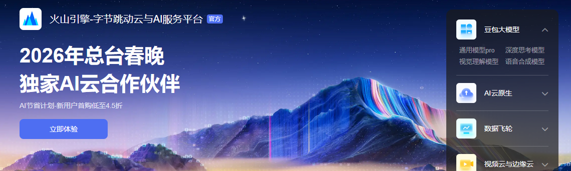 火山引擎是字节跳动旗下的云和AI服务平台,提供大模型、云计算及多模态技术支持,最新动态是成为2026年央视春晚独家AI云合作伙伴。下面给大家带来了火山引擎官网入口:https://www.volcengine.com/。