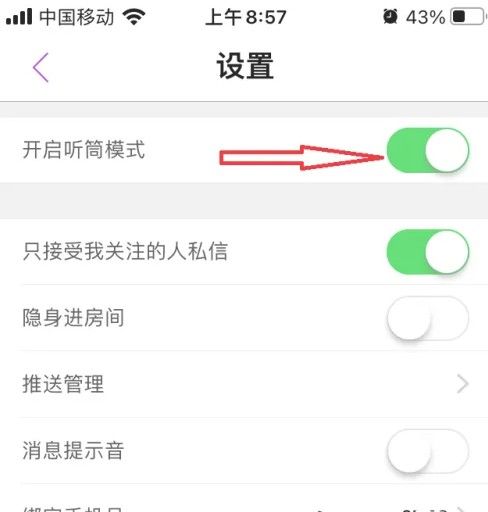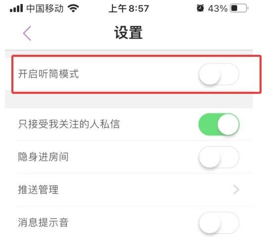 在蜜疯直播设置页面,点击【开启听筒模式】右边的开关