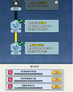 在《生存33天》中,头衔是提升实力的关键。它不仅能逐步解锁至多5个上阵位、开启军械库与竞技场等核心玩法,还能大幅提升资源获取与挂机效率。晋升完全依赖军功,主要通过首次击败Boss和通过首领试炼三星挑战来获取。