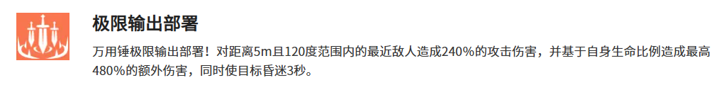 极限输出部署这个终极技能伤害倍率挺高的,对5米范围内120度扇形区域的敌人造成240个百分点攻击伤害,还会根据自身血量比例追加最高480个百分点的额外伤害。不过达芙妮毕竟是个捍卫者,输出能力不是她的强项,这个大招主要还是用来控制敌人,3秒眩晕时间能给队友创造不少输出机会。支援技能补充精力可以在使用主要技能后给全队减少30个百分点最终伤害,持续10秒,这个效果跟遗物的减伤叠加之后,能让整个队伍的生存能力得到明显提升。