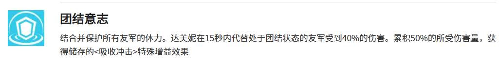 达芙妮的技能机制跟这个遗物的配合也相当不错。她的团结意志技能可以代替队友承受40个百分点的伤害,持续15秒时间。在这个过程中她会累积受到的伤害的50个百分点,转化成吸收冲击这个特殊buff。配合遗物的减伤效果,达芙妮在开启团结意志的时候能够帮队友挡下更多伤害,而且自己也不容易被打死。铁匠之神的祝福这个技能能给全队增加25个百分点攻击力,同时给达芙妮自己套上铠甲buff,吸收体力上限25个百分点的伤害。这个铠甲buff正好能触发遗物的额外减伤效果,让达芙妮在开大的时候变得特别硬。