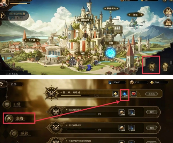 3、点击任务,找到主线任务,在主线任务中可以看到有技能点奖励的任务,完成就可以了