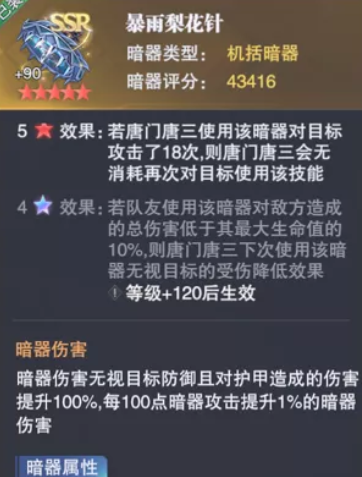 玩家也可以使用暴雨梨花针,这也是一个非常适合唐僧使用的暗器,如果使用这个暗器向目标攻击18次,那下一次攻击的时候,不需要任何消耗就能触发,等级继续提升,达到彩星之后,还能无视目标的受伤降,降低效果,可以去努力提升等级,把等级提升到120级,借助这个暗器,能让玩家在游戏里有更强的攻击力,这些暗器也是强化角色或者队伍能力的一种方式,非常推荐大家去选择自己喜欢的暗器开启攻击。