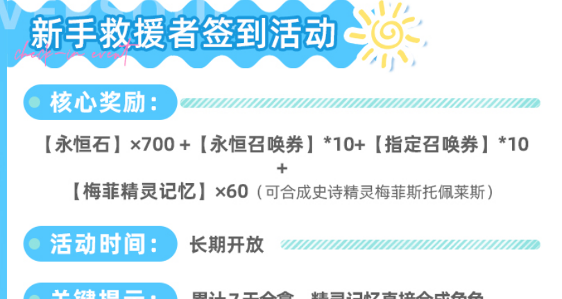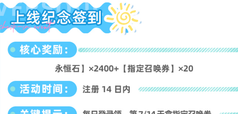 当前开放的双签到机制覆盖不同时间节点:其一是“新手救援者签到”,连续签满7日可获700颗永恒石、10张永恒召唤券及10张指定召唤券;其二是“上线纪念签到”,持续14日,总计发放2400颗永恒石与20张指定召唤券。两项叠加后共得3100颗永恒石,折合约10张永恒召唤券的价值,属于低投入高回报的固定收益来源。