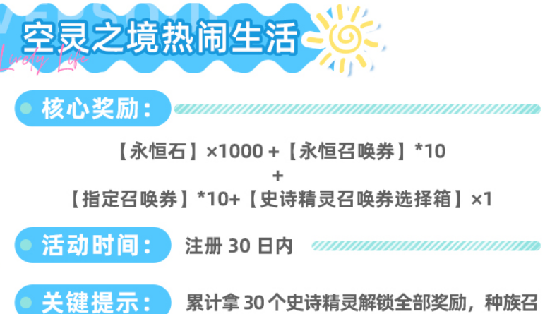 “空灵之境热闹生活”活动限时30天(自注册日起计算),达成累计收集30个史诗精灵的目标后,即可解锁全部奖励,包括1000颗永恒石、10张永恒召唤券、10张指定召唤券及1个史诗精灵召唤券选择箱。该目标在常规推图与日常抽卡节奏下可自然达成,无需额外刷取,奖励结构均衡,兼顾资源、抽卡与定向培养需求,综合价值突出。