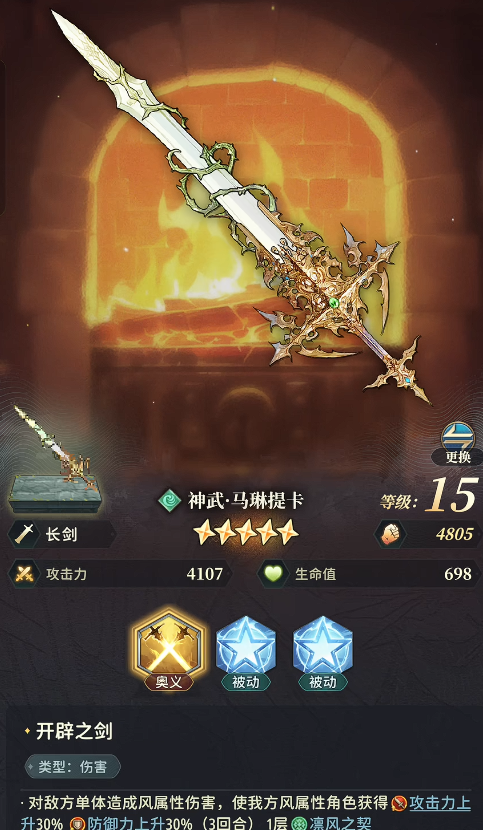 该武器的核心机制为奥义技“风剑”:释放一道高倍率风属性伤害,并在命中后为角色赋予持续增益——攻击力与防御力同步提升30%。需特别注意的是,该效果仅对风属性角色生效,因此马琳提卡本质是一把高度特化的风系专武,非风属性角色佩戴时无法触发关键增幅,整体收益大幅受限。
