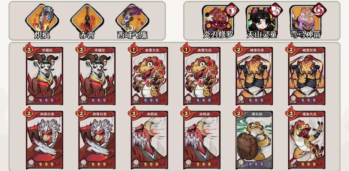 装备方面,主推炽灵四件套+卧龙之袍组合。炽灵四件套提供20%治疗加成,并在战斗首次凑齐四张灼烧牌时,恢复2点真气并额外抽两张牌,极大强化自残流续航与过牌能力。除主流自残路线外,亦可尝试火系爆发变体,例如搭配天道剑圣与圣僧,利用灵童减怒与增伤特性放大灼烧叠层速度及真气技能释放频次,提升全自动PVE流程稳定性。但需注意,该变体在综合输出与容错率上仍逊于完整自残体系,故不作为首推方案。