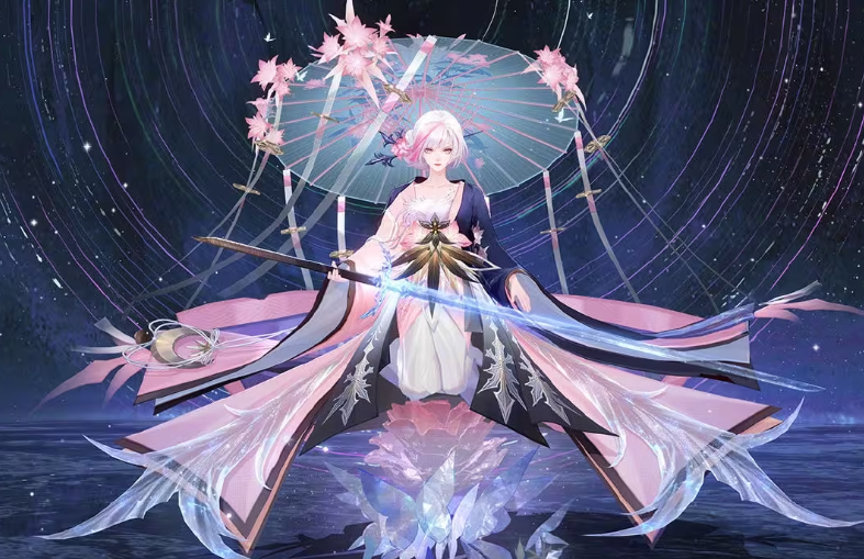 晨霜未晞之时,她已执伞端立于庭前。倏忽间衣袂翻涌,冰晶凝于剑身,卷起千层霞色,斩落漫天流紫云光。