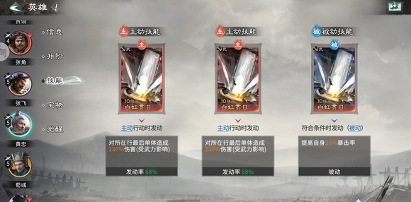 技能配置方面,黄忠主技能首选“白虹贯日”——该技能可对所在横排最末单位造成高额单体伤害,与天赋形成后排定点清除闭环;追击技同样选用“白虹贯日”,可额外提升10%暴击率,并附加三段随机单体攻击;被动技亦推荐此技能,进一步叠加20%暴击率,显著强化黄忠作为核心C位的瞬时爆发阈值。