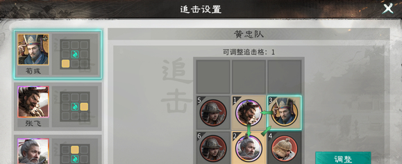 布阵逻辑需严格遵循三层结构:前排藤甲兵承担承伤职能,稳固防线;中后排配置双穿杨军,强化穿透输出能力;核心输出位黄忠置于后排中央,确保其始终处于荀彧的追击格内,从而稳定触发“王佐”增益效果;张飞则部署于黄忠追击格,荀彧再置于张飞追击格,由此形成三重追击链,保障全体主力高频释放追击技。