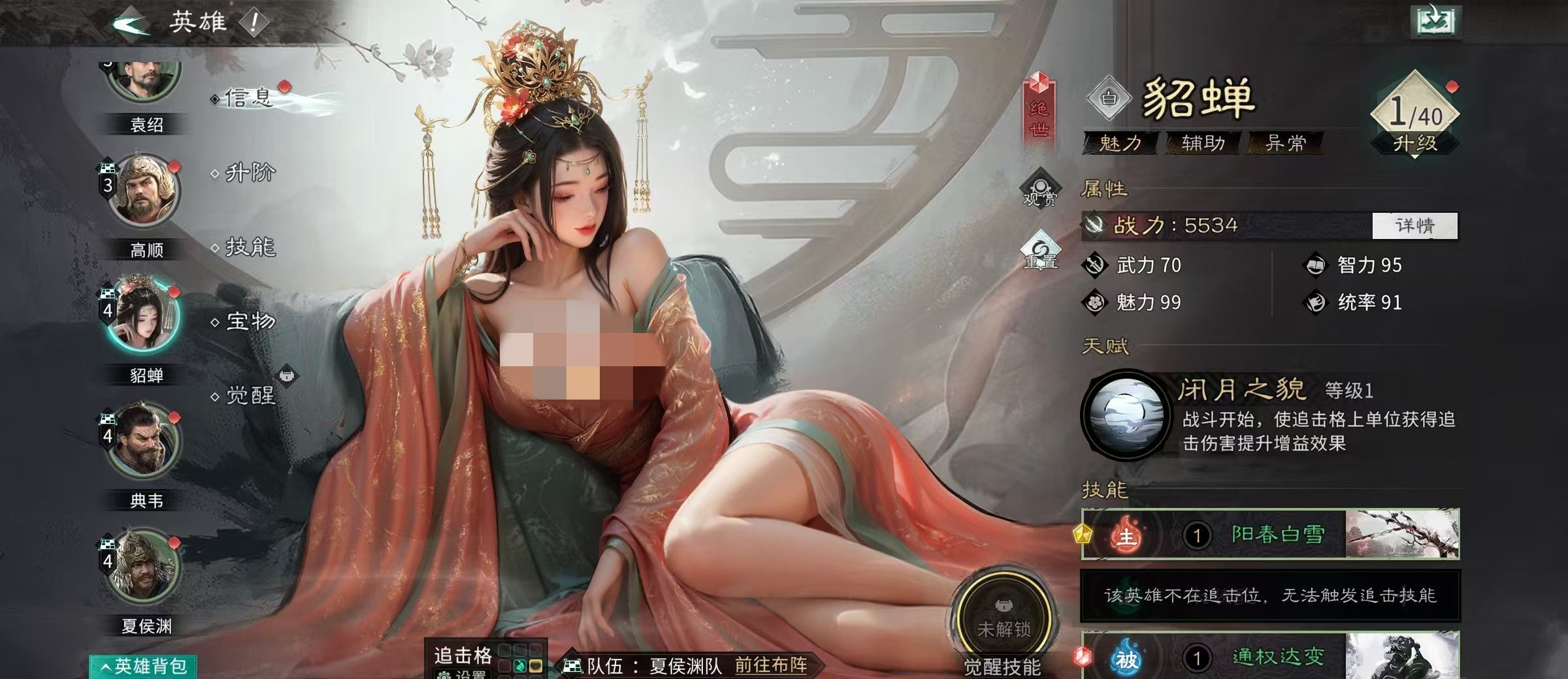 本套推荐阵容采用“关羽—郭嘉—貂蝉”铁三角组合,定位为高爆发、强联动、快节奏的斩杀体系。其中关羽承担主输出与终结职能,依靠天赋锁定敌方武力最低目标并叠加畏状态,能量满层后触发威震华夏实现精准斩首;郭嘉作为核心副C,不仅提供多段范围伤害,更关键的是提升全队天赋技能发动概率,强化连锁反应;貂蝉则负责增益传导与控制衔接,其天赋可大幅提升关羽对男性单位的伤害,并赋予额外两次追击机会。