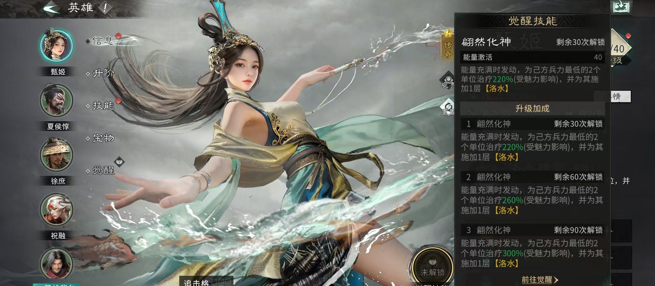 甄姬为传奇品质治疗型辅助武将,基础定位明确——以持续续航与生存强化为核心职能。其天赋技能可在主动释放后,对追击格内单位实施治疗,并同步提升目标闪避率;完成觉醒后解锁专属觉醒技:当能量满格时,自动为己方兵力百分比最低的两名武将施加治疗,并附加“洛水”状态。该状态属叠加型增益,每层提升5%闪避率,持续两回合,且无层数上限,可随战斗进程不断累积,显著强化队伍整体容错能力。