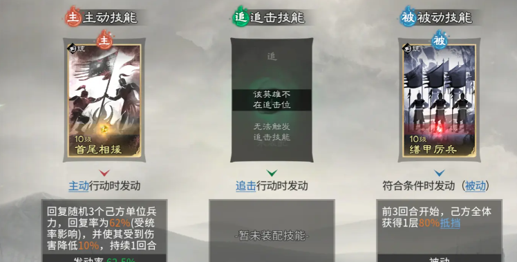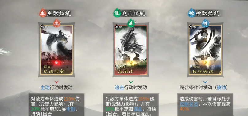 贾诩在此体系中并非主控者,而是控制链的最大受益者。当队友成功施加控制效果时,贾诩可对被控单位额外造成58%伤害;若混乱单位对其造成伤害,则可恢复自身兵力;若友军误伤贾诩,还将触发额外减益效果。其技能组合聚焦于精准收割与爆发强化:主动技能必带【兵无常势】,自动锁定敌方兵力最低单位进行打击,加速敌方减员进程;追击技能同样推荐【计谋巧变】,该技能伤害随敌方所受控制状态数量增加而提升,中后期控制叠满后可打出极高瞬时爆发;被动技能延续【兵不厌诈】,确保在控制链持续运转期间稳定提升输出权重。整套阵容的战术支点,正是董卓的【挑衅】与诸葛亮的【技穷】双控协同,构筑起难以突破的节奏壁垒。