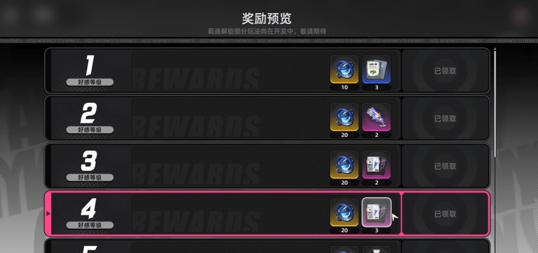 持续投递偏好礼物可稳步提升羁遇值,当累计达到指定等级阈值时,角色界面将激活“领取奖励”按钮。不同好感等级对应差异化奖励池:前五级奖励以通用型资源为主,涵盖基础装扮部件与功能道具;自第六级起,奖励内容开始按角色背景设定展开主题化设计,例如专属语音包、动态头像框、限定动作模组等。