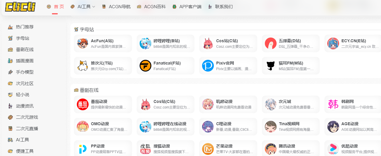 呲哩呲哩CliCli-收录了数千二次元优质站点,包含免费看番,二次元社区,二次元小说,二次元游戏,手办周边,二次元直播等,并且只收录长期运营且稳定安全的网站,尽情的畅游二次元世界吧!