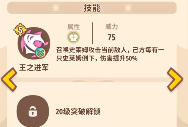 主动技能“群聚突袭”具备动态成长机制:释放后召唤3只小史莱姆协同进攻;每有1只己方小史莱姆阵亡,该技能下一次伤害提升50%,最高可叠加至300点固定伤害值。此数值在当前版本伤害梯度中位列T0梯队,配合献祭流打法(如开局快速牺牲低阶史莱姆单位),可在第二回合达成瞬杀效果,对高资质神兽单位亦具压制力。