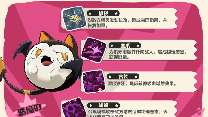 叮叮恶魔拥有恶魔系与翼系双重属性,在战斗中以低血量触发高伤技能为核心机制,同时高度依赖吸血效果维持生存能力。其“灾厄”类技能往往在血线低于特定阈值时激活,形成稳定收割节奏,因此队伍配置需兼顾控血、承伤与状态辅助等多维支持。