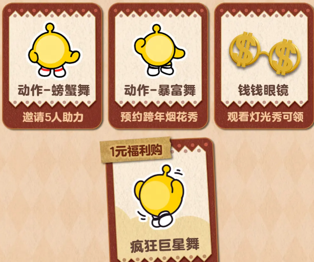 本次元旦版本同步上线多款限定外观与动作道具: - 螃蟹舞:完成5人助力任务即可免费解锁; - 暴富舞:成功预约跨年烟花秀后自动发放; - 钱钱眼镜:观看指定灯光秀内容后直接领取; - 疯狂巨星舞:需通过游戏内商城以1元价格购得。