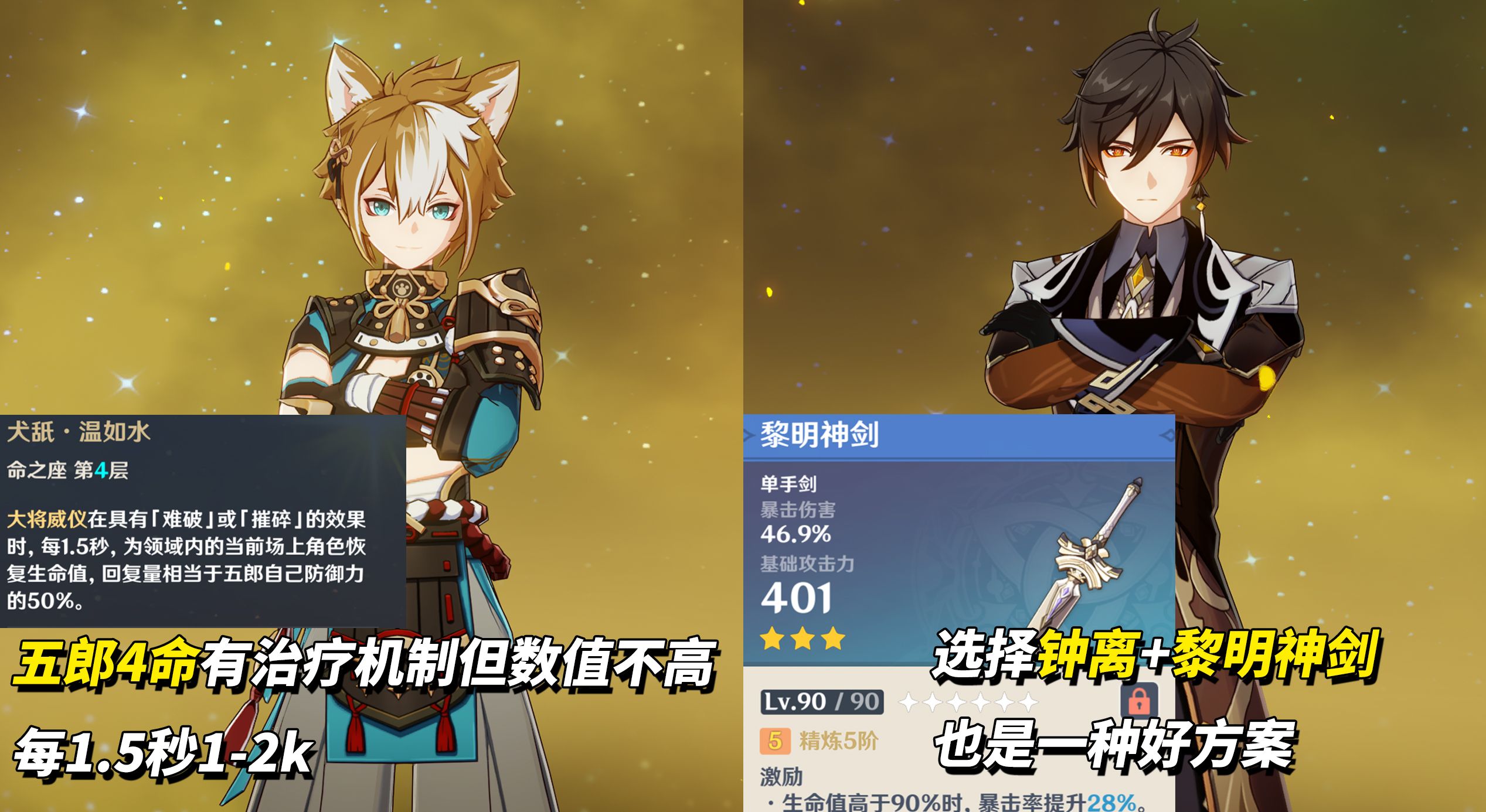五郎的治疗在4命,若你没有,也可看看钟离,有高额护盾庇护让兹白携带黎明神剑,也是不错的方案。希诺宁,0命只可搭配2岩队伍,2命才能入3岩队。伊涅芙算是次选,部分对群环境或者需感电破机制可考虑。