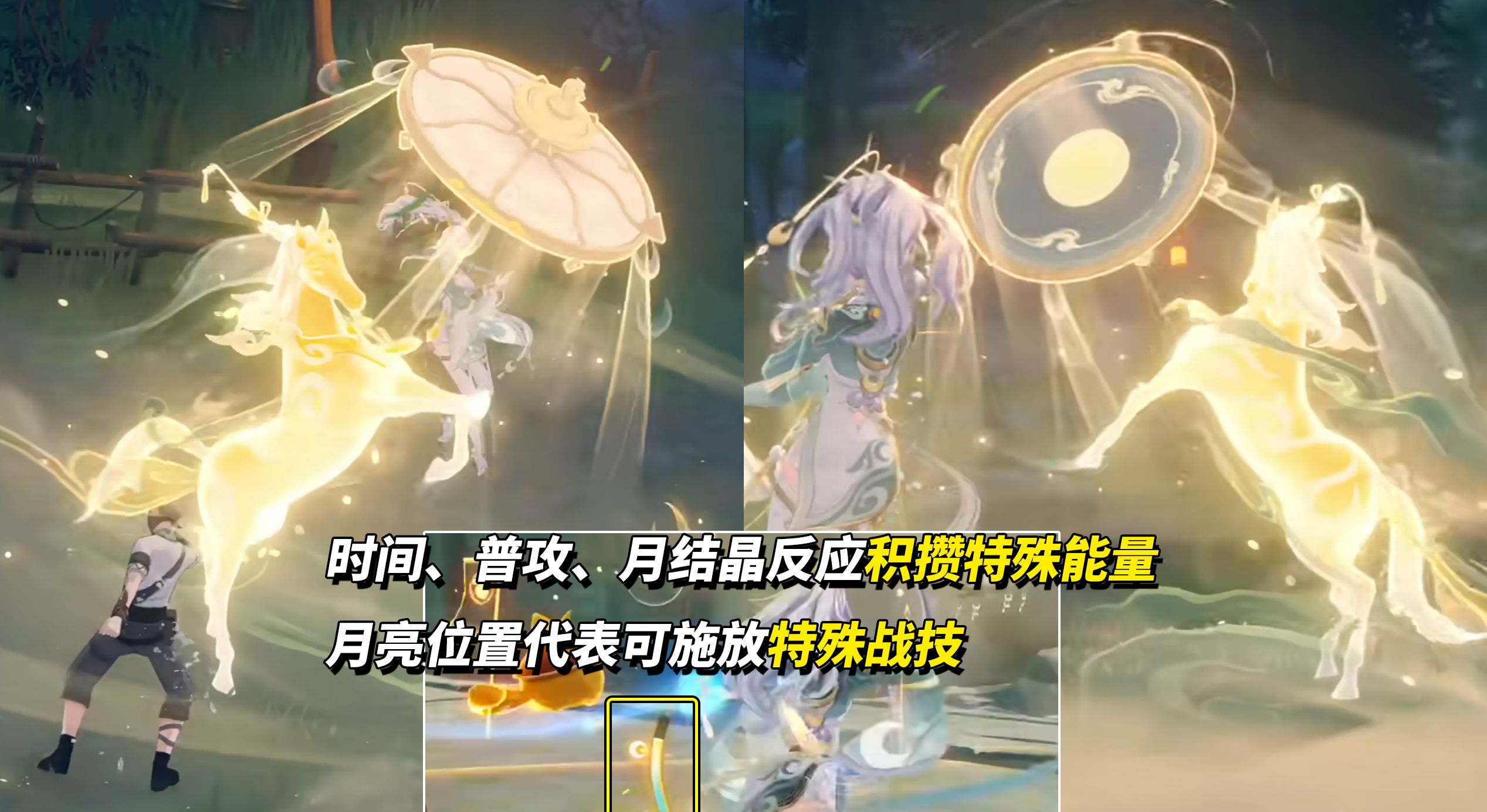 ②角色身旁多了一管特殊能量条,随时间增长、触发月结晶、持续普攻都会获得特殊能量。当旁边亮起月亮图标时,兹白战技会切换为特殊战技「灵驹飞踏」,施放法术造成月结晶反应伤害。一次战技期间可施放多次「灵驹飞踏」。