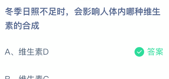 以上就是冬季日照不足时,会影响人体内哪种维生素的合成,支付宝蚂蚁庄园2026年1月13日答案最新,更多精彩内容,请点击关注更新!