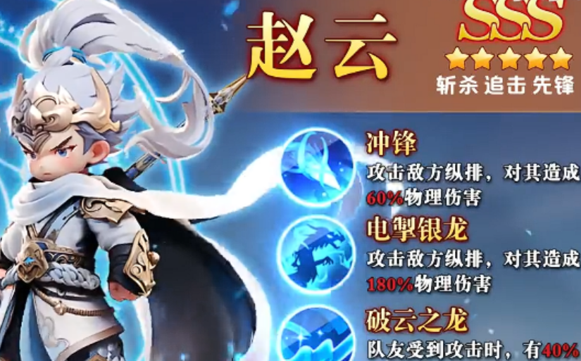 先说赵云这个角色,他普通攻击可以给自己加一个叫龙胆的状态,每次加一层,攻击力就会提升一些。这个状态最高能叠到10层,技能是攻击敌人竖着的一排。当龙胆有2层的时候,放完技能还能再来一个回合,不过这个额外回合每次只能触发一次,触发后龙胆会清空。他的天赋比较特殊,队友被打的时候有机会给他加龙胛层数。等级升到名将1星之后,回合外获得的龙胆到10层会马上发动一次攻击。3星的时候每次获得额外回合都会增加暴击率和暴击伤害。到了神将1星,血量第一次掉到30%以下会立刻获得新回合,还能提升2回合的暴击率和吸血效果。