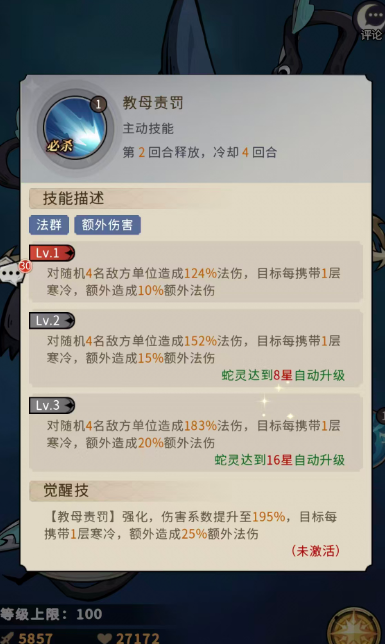 最后是教母菲娅的罚站守则这个被动技能,在这个被动当中会让她对自身可以造成的寒冷状态施加的单位,在造成的伤害上面可以提升10%的效果,对有冰冻状态的敌方进行攻击,在伤害上面会额外提升10%的效果,所以在这个技能使用之前是一定提前用来上面的几个技能的,在连招当中这个技能也是只能当中最后的招式使用,才可以得到输出最大化的能力,而在蛇灵达到20星的时候,此时培养之后的技能数值会有所提升,比如升级了之后教母菲娅对施加了寒冷状态的那个敌人进行输出,这里造成的伤害提升20%,暴击提升10%,而之前有冰冻在身上的敌方她会造成的伤害额外提升20%、暴击提升10%。