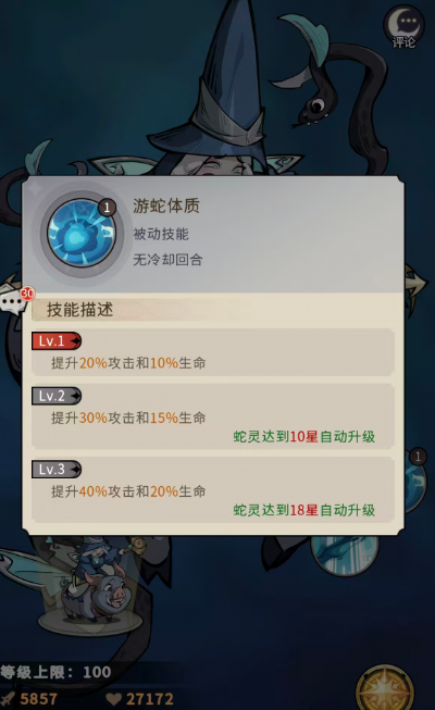 当然大家想要教母菲娅在一开始就获取了自身的增益效果,这里可以用到的还有游蛇体质这个被动,这个被动能力在不一样的等级当中给她带来的提升数值是不一样的,一开始在教母菲娅没有培养之前,可以带来的是在攻击属性上面可以提升20%,而攻击提升作为基础的时候,还有10%生命一样可以提升,一样在教母菲娅达到18星的时候,这个效果则会自动升级,升级之后提升的数值就变成了两倍的能力,也就是40%攻击和20%生命提升效果,所以在达到被动三级的时候一开始教母菲娅就可以得到这样高数值的基础能力提升啦。
