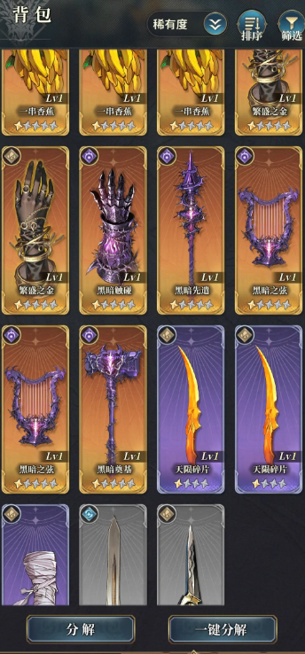 游戏内武器装备的品质,可以分为金色、紫色、蓝色、绿色、白色,紫色以下的装备除了前期过度使用,后期和中期基本上没有更高的发展空间,建议玩家直接通过武器分解来换算成为基础升级材料,金色装备和紫色装备,可以通过组成同一个武器套件,来增加攻击效率。