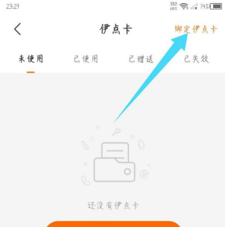 在打开的伊点卡页面,点击右上角的绑定伊点卡选项。