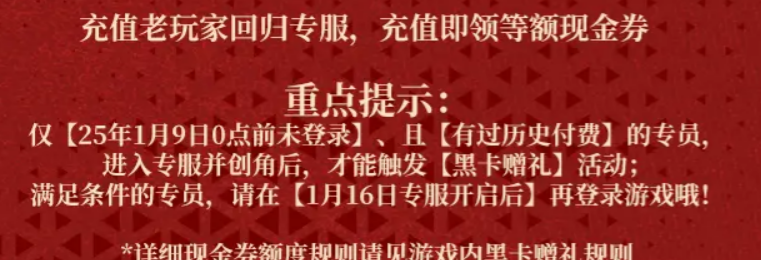 黑卡赠礼的参与条件有两个。第一个是账号最后登录时间必须在2025年1月9日零点之前,第二个是账号有过充值记录。同时满足这两个条件的玩家,在1月16日庆典专服开启之后去创建新角色,登录进去就会自动触发这个活动。这里要提醒一下,一定要等专服开了再去,不要提前登录老服,免得影响活动的判定。