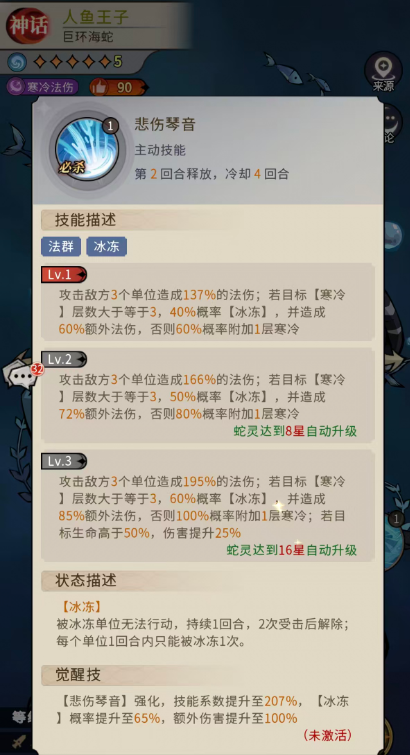 人鱼王子的主动技能叫做沉溺歌谣,这个技能上就有一定的寒冷效果可以用到的了,攻击时可以给敌方全体造成64%的法伤,且有50%概率附加【寒冷】的状态,这里【寒冷】的状态会让敌人身上的防御降低4%,速度降低5%,叠加5层的时候这里的速度影响就非常大了,且在达到技能三级的时候就变成攻击敌方全体造成92%的法伤,70%概率附加【寒冷】,同时为自己附加伤害值30%的护盾,所以在这里他后期给自己带来的保护能力也不弱,且相比其他的蛇灵,人鱼王子身上的等级提升很快,只要14星的时候就可以解锁技能等级3的能力,所以后期他能够达成的觉醒技强化也很快,得到强化之后的他在技能系数上面直接提升至98%,而【寒冷】状态施加成功的概率提升到80%,算是非常高的一个数值了。