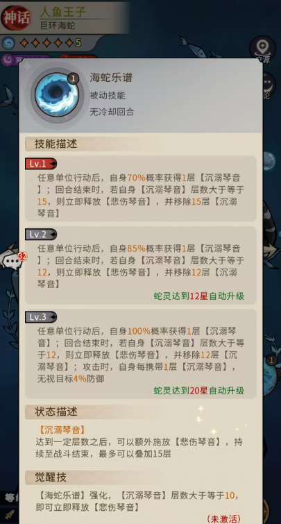 最后海蛇乐谱被动当中,是只要有队内任意队友行动,此时人鱼王子自身会有70%的概率获得1层沉溺琴音,且在这个行动的回合结束之后,如果自身的沉溺琴音层数大于等于15,那么人鱼王子则会立即释放悲伤琴音技能,移除掉身上的15层沉溺琴音,后期升级之后还会在攻击时,让这里每携带1层的沉溺琴音带来无视目标4%防御的增益,沉溺琴音达的效果就是在其中到一定层数之后,可以额外施放悲伤琴音,这个效果会一直持续至战斗结束,最多的情况下是可以叠加15层,后期直到觉醒的时候,这里的技能强化之后就会变成沉溺琴音层数只要是大于等于10,那么此时的人鱼王子就可以立即释放悲伤琴音,不用再等到15层了。