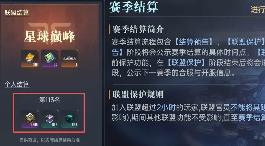 赛季结算机制也会直接影响到下一个赛季的补给份额,玩家在完成巅峰赛之后,会获取赛季的巅峰积分,游戏会根据玩家当前的巅峰赛排名,进行当前赛季的结算,结算分为三个阶段,它们分别是“结算预告”、“联盟保护”、“结算通告”,建议玩家在联盟保护之前,将自身的结算积分拔高,从而进一步增强下个赛季的赛季补给。