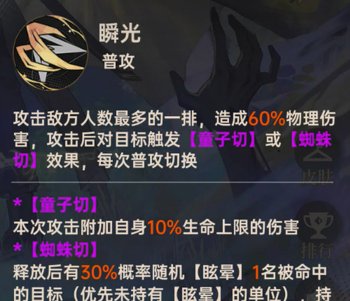 先说说他的普攻机制吧。天照命的普攻会攻击敌方人数最多的那一排,这个设定就决定了他比较适合打群体战。普攻会在童子切和蜘蛛切之间切换,童子切能增加额外伤害,蜘蛛切有概率眩晕目标。这两个效果交替出现,让他的普攻变得很灵活。特别是蜘蛛切的眩晕效果,虽然只有30%触发率,但是在关键时刻能打断敌方的节奏。而且这个眩晕会优先给没有被眩晕过的目标,这样就不会浪费控制效果了。等到超限3级之后,持有王权状态时有50%概率同时触发两个效果,这时候输出和控制就能兼顾了。