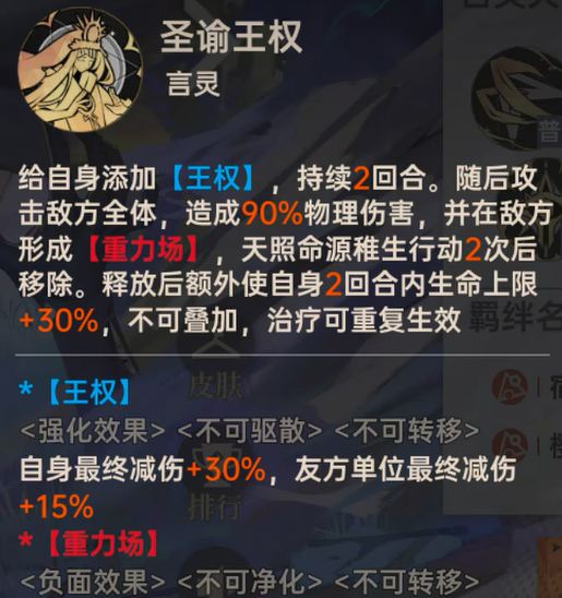 圣谕王权这个言灵技能是天照命的核心能力。释放之后会给自己加上王权状态,持续2回合,这期间自己的减伤提升30%,友也能获得15%减伤。同时攻击全体敌人并在敌方阵营制造重力场,这个重力场会降低敌人的攻击和速度各10%。更重要的是,释放技能后还会额外增加30%生命上限,虽然不能叠加但是治疗可以重复生效,这就让天照命的续航能力变得很强。重力场的存在时间是天照命行动2次,算下来差不多能覆盖好几个回合,对敌方的削弱效果还是挺明显的。