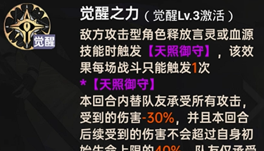 天照领域这个强化效果让天照命的防守反击能力大幅提升。领域期间自己的誓守触发率增加30%,全队异常抵抗也提高了。更厉害的是受到攻击后有30%概率用普攻反击目标所在的横排,这就让他变成了一个反击型角色。敌人越是集火他,他的反击次数就越多,配合普攻的童子切和蜘蛛切效果,能打出不错的输出。