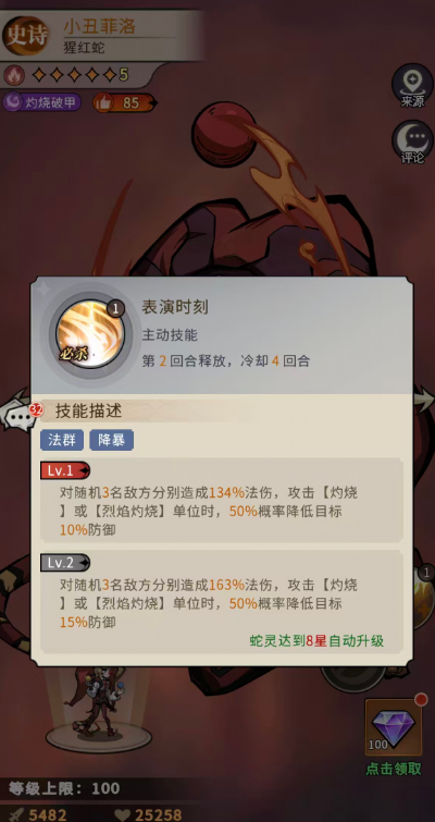 首先是小丑趣味这个技能,这是小丑菲洛的主动技能,可以在第1回合释放,就是需要冷却个回合,才可以接着再次使用,其中是包含有法群灼烧的效果,可以对前中排分别造成82%法伤,所以在这里先手输出可以覆盖的范围只是略过了后排而已,而且其中有50%概率可以施加灼烧,灼烧状态的效果就是每回合损失小丑菲洛攻击15%的生命,大家最多可以把这个状态叠加到5层,此时失去的生命数值就换成了非常高的输出数值,而且在蛇灵达到6星的时候他的技能就升级为对前中排分别造成99%法伤,60%的概率可以成功施加灼烧。