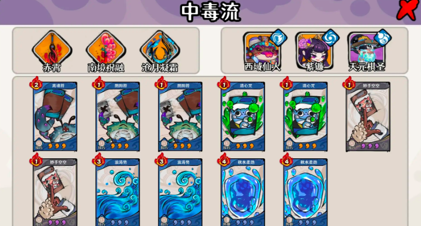 【中毒流】——低星启动、无视反伤、范围压制型阵容 核心组合:西域仙人 + 紫镰 + 天元棋圣(三水属性) 关键要求:紫镰需达四星,其余角色一星即可激活基础循环。该体系不依赖真气技能,全程以毒系持续伤害为核心输出逻辑,对护甲与反伤类敌人具备天然克制效果。实战覆盖范围广,对中前期至中期多数幻境关卡均能实现压倒性清场效率。所需卡牌清单:离魂符×1;阴阳符×2、清心咒×2、妙手空空×2、浪涛势×2、秋水柔劲×2。