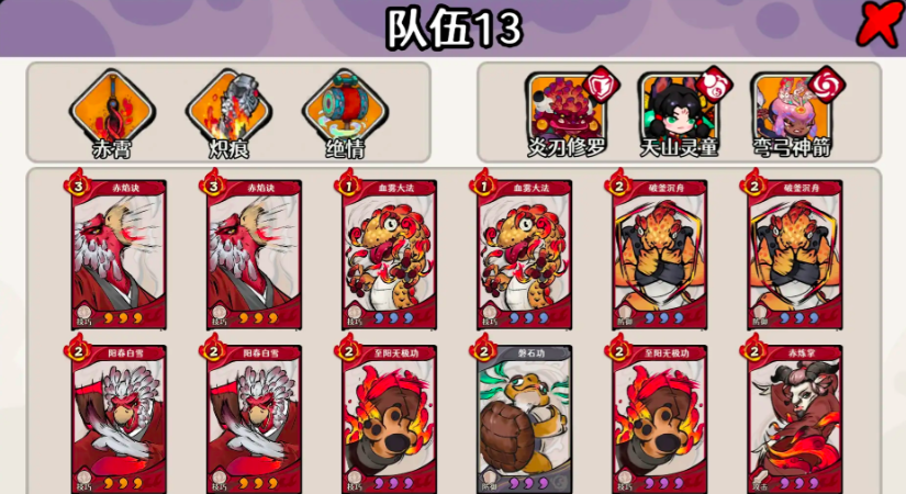 【自残火流】——灵童主C、容错优异、高伤溢出型阵容 核心组合:炎刃修罗 + 天山灵童 + 弯弓神箭 定位说明:天山灵童担任绝对主输出位,自身生存韧性与伤害成长曲线优秀,实测两星配置下可稳定通关至45关。该流派对操作节奏要求适中,适合进阶过渡阶段玩家。卡组配置:赤焰诀×2、血雾大法×2、破釜沉舟×2、阳春白雪×2、至阳无极功×2;另需磐功×1、赤炼掌×1。
